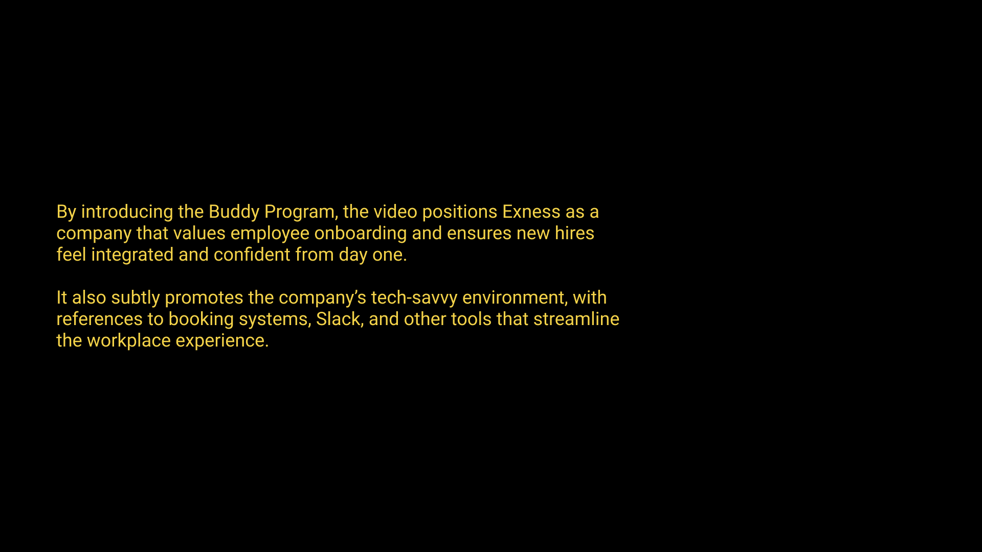 This video is a humorous and relatable take on the first-day-at-work experience. It is designed to highlight new employees' challenges and how Exness addresses them through its Buddy Program. The narrative follows a new hire navigating the overwhelming and often awkward moments of their first day—getting lost, struggling with parking, figuring out desk bookings, mistaking the side activities, QR codes, floors and more. The video uses lighthearted, exaggerated scenarios to emphasise the importance of guidance and support for new employees.
