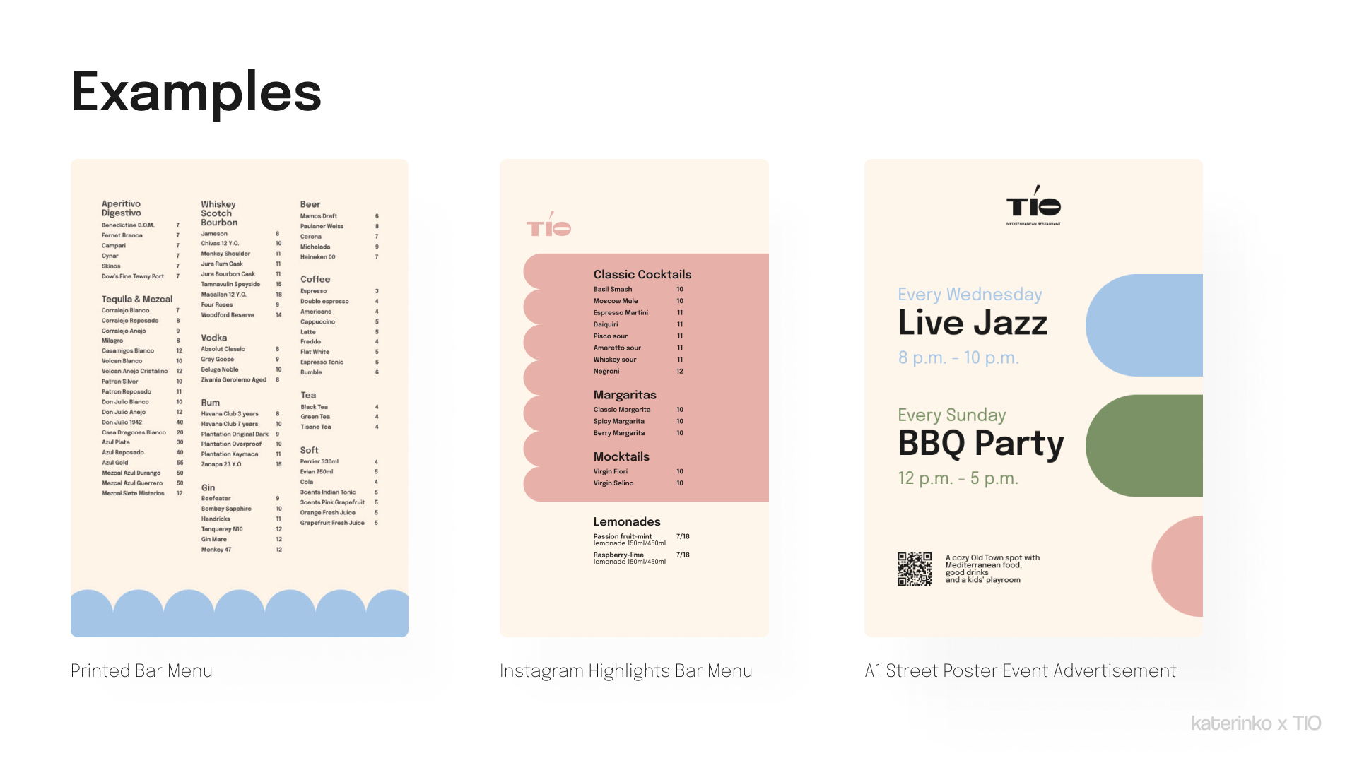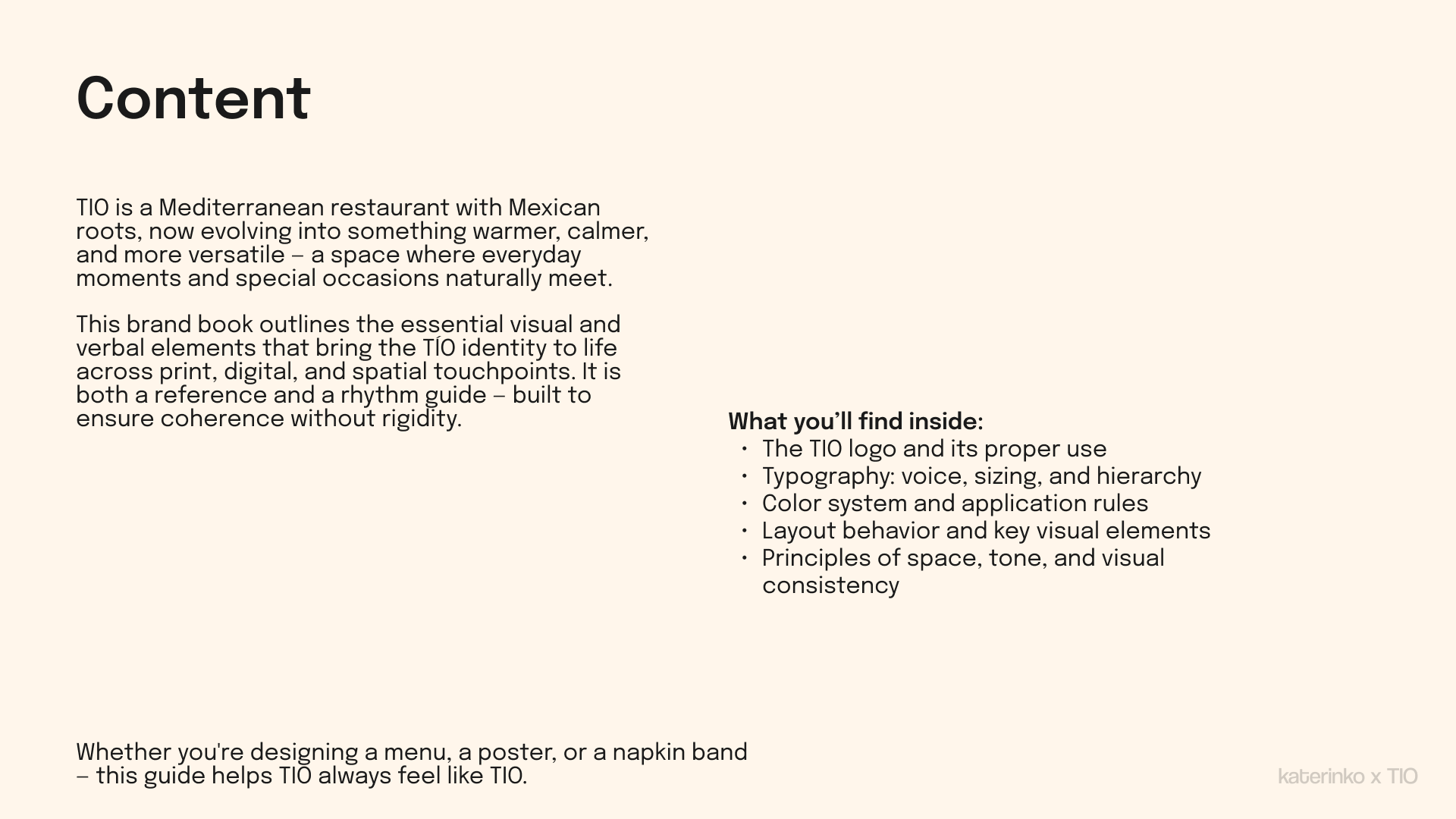 This project included visual direction, typography, color system, layout behavior, and updated applications like menus and posters — all tailored to fit TÍO’s relaxed yet elevated personality.