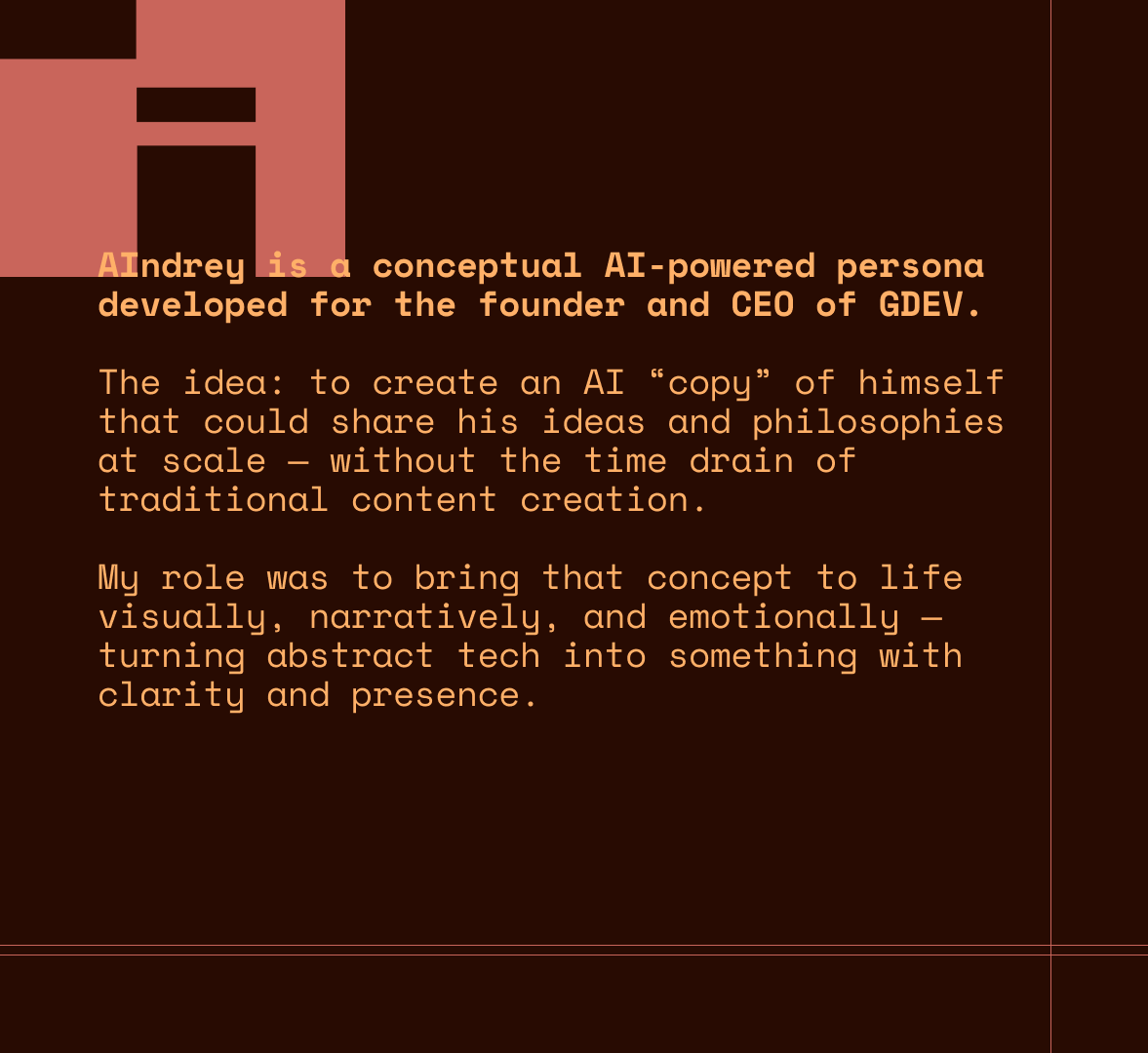 I developed the brand identity, narrative structure, and visual direction for AIndrey — an AI-generated version of GDEV’s founder. A multidisciplinary concept blending design, video, and generative content, created to make synthetic communication feel real, human, and intentional.